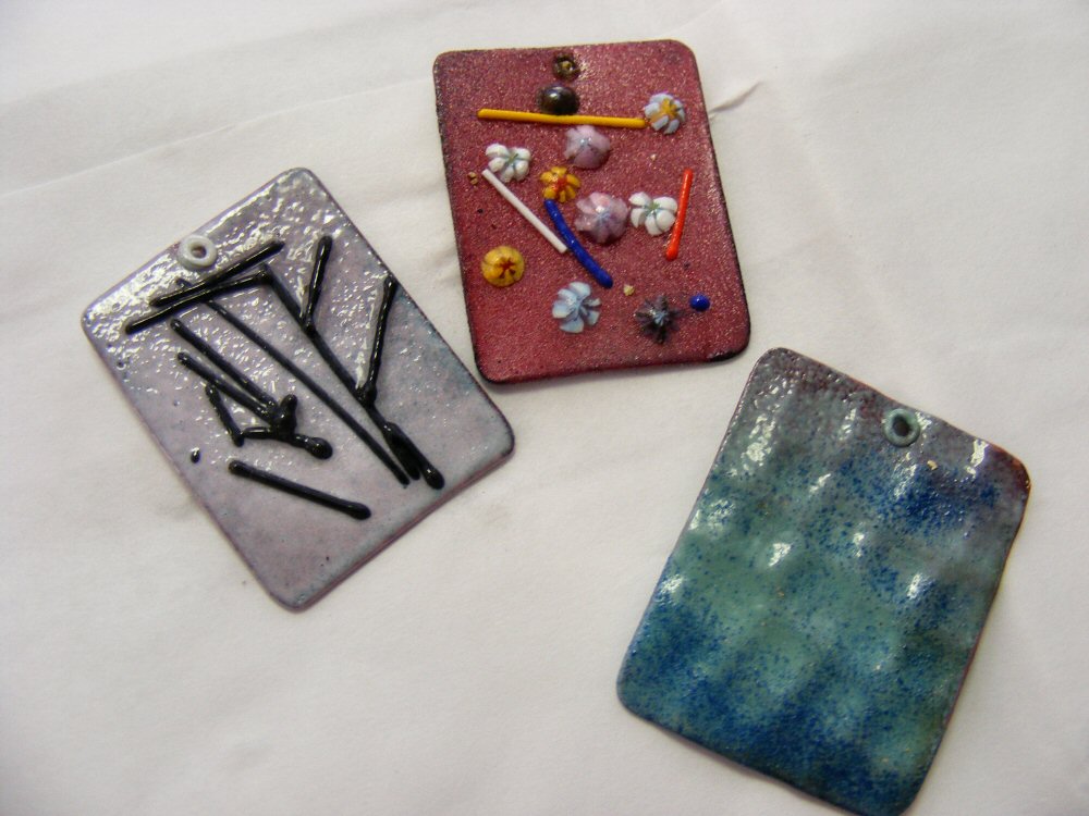 I had already planned to "cheat" a little - I had bought a torch tripod, figuring I could place the pendants on the screen, add enamels, stringer, millefiore - whatever, without worrying about the flame PLUS I could add them with my dominant hand, and not worry about them falling off because I couldn't hold both hands steady in the flame! So one at a time, I placed a pendant on the tripod, made the desired changes, and fired them with my torch on the tripod. And here they are, along with a heart pendant I made when I took Barbara's seminar in Florida - this heart was all orange-peely to, so I knew it needed to be brought to a higher temp.